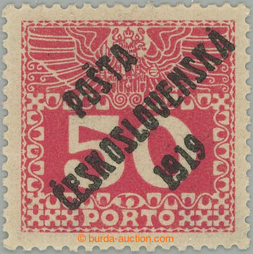 Pof.71, Velké číslice 50h červená, I. typ přetisku; stopa po nálepce, atest Vrba, zk. Lý, Gi, celkově velmi pěkný kus hledané známky!Vyvolávací cena: 28 000 Kč +57,1 %