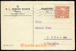 1907 - 15 2ks firemních obálek vyfr. zn. s perfiny, 1x zn. 10h s perfinem K58 Julius Kussi Praha 3.XII.07. 1x s perfinem "J.G." M.Lehner Wien 15.V.15. Zachovalé. 1913 lístek s přítiskem vyfr. zn. FJ 5h s perfinem "B.K." B57 D, bratří Kohmové Vsetín, DR VLP Vsetin - Mähr. Weisskirchen 5.6.13, zachovalé. 1913 obálka s přítiskem firmy Mendel & Löwy Wien, vyfr. zn. 10h FJ s perfinem "M&L / Wien", DR Wien 23.I.13, zachovalé. 1914 obchodní lístek se zn. Mi.142 s perfinem AH - Anton Hübl, (Maxa A28), identifikační celistvost, DR Aussig 22.X.14., vzadu stopa po přilepení, jinak pěkné. 1915 odpovědní obálka Vídeňské pojišťovny vyfr. válečnou zn. 10h s perfinem "C.S." C38/E firmy Carl Siegl sen., DR Mähr. Schönberg 23.X.15, bez poškození. 1915 odpovědní obálka Vídeňské pojišťovny vyfr. válečnou zn. 10h s perfinem "C.S." C38/E firmy Carl Siegl sen., DR Mähr. Schönberg 6.XI.15, bez poškození. 1915 R Ex dopis velkého formátu, tvrdý papír, rozříznutý, vyfr. zn. 3x 25h FJI, Mi.3x147 s perfiny Laurin a Klement, DR Mladá Boleslav 1.XII.15, přích. Praha TGF 1.XII.15. 1917 firemní lístek vyfr. zn. 10h Koruna s perfinem "GS/AG", G38 C, Georg Schicht, DR Sedletz - Krammel 7.IV.17. Bez poškození. 1917 lístek vyfr. zn. 10h FJ s perfinem "L.S.", L32 D, Zemská úřadovna vdovského válečného fondu Landes Stelle. DR Praha 1.VI.17. Zažloutlá místa na lístku. 1918 odpovědní dopis vyfr. zn. 15h Karel s perfinem "JR", J89 A, Jos. Riedel, DR Unter Polaun 22/II 18. Lehké zažloutlé skvrny na obálce. 1918 sestava 15ks novinových známek s perfiny (4 druhy), též na dvou a třípásce, zajímavé. 1918 sestava 22 různých perfinů na známkách ČSR I. (1x RU), pochází z Rakouska 1919 - 1921 sestava 89 známek Hradčany s různými perfiny, část na výstřižcích, zajímavá nabídka. 1919 - 20 sestava 3ks perfinů na zn. emise Legionářské 25h "F.W." s DR Prostějov F74/B, emise PČ1919 maďarská Ženci 25f s perfinem "BIK", emise Husita s perfinem "E.V." E53/C. 1925 6 blok zn. 50h OR zelená s perfinem "B.H./M.O." B50/D, vždy pozitivní a negativní průpich. DR Moravská Ostrava 2.IV.25. Pěkný kus. 1921 větší část mezinár. průvodky CPP15 vyfr. zn. 2x 400h Hradčany + 20h Holubice s perfinem"J.N." J76/B firmy J.Niessner, DR Cvikov 12.III.21, bez poškození. 1918 předtištěný lístek firmy Jindřich Franck Synové, zaslaný jako tiskopis vyfr. rak. zn. 3h Koruna s perfinem "FSHF", DR Pardubice 7.XII.18. Bez poškození. 1918 reklamní obálka vyfr. rak. souběžnou zn. 20h Karel s perfinem "S.S." S52/B firmy S.Schulhof, DR Praha 28.XII.18, bez poškození, dekorativní. 1919 dopis vyfr. 4 barevnou frankaturou Hradčan z toho 1x zn. 3h fialová s perfinem J89 JR (Josef Riedel - DOLNÍ POLUBNÝ), DR Komotau 1.X.19. Předtištěná odpovědní obálka na A.Deutsch do Reichenbergu. Přehyb, stopy provozu. 1919 firemní lístek vyfr. zn. Pof.7 s perfinem R - S.L.Reimann synové (Maxa R5), horší SR Praha 31.X.19, ident. celistvost, zachovalé. 1919 firemní lístek ze známkou Pof.7, nezoubkovaná, s perfinem F.P. - Friedrich Pollak (Maxa F55), DR Fulnek 23.XII.19, dva otvory po děrovačce zalepeny zezadu 1919 - 1921 sestava 10ks ústřižků balíkových průvodek, vyfr. známkami s perfiny, různé frankatury a DR, zajímavé. 1920 firemní okénková obálka vyfr. zn. Pof.7 4x, s perfinem G.H. - G.Hell (Maxa G18), SR Opava 6.VIII.20, horší přích. raz. Turč. Svätý Martin, identifikační celistvost, zachovalé 1920 - 1937 sestava 15ks celistvostí, výstřižků, ústřižků, z části identifikačních, zajímavé, k prohlédnutí. 1921 firemní obálka vyfr. zn. 60h OR s perfinem "S.S.", S52 B, Salomon Schulhof, DR Praha 6 / 20.VI.21 (neúplný otisk), včetně obsahu - faktura. 1921 ústřižek pošt. průvodky vyfr. zn. HaV 1920 100 + 200h s perfinem "G.N.", G28 B, Glassfabrik Neusattl, DR Nové Sedlo u Lokte 1.III.21. 1923 firemní obálka vyfr. zn. 10h Holubice s perfinem"JO", J80 A, J.Otto, DR Praha 12.X.23. Zachovalé. 1923 - 30 sestava 18 ks identifikačních celistvostí vyfr. zn. s perfiny jako: L20, A36, K19, K20, N8, V17, C16, B26, G32 a další. Vše zachovalé, část s dekorativními přítisky. 1926 firemní lístek vyfr. zn. Pof.156, s perfinem G.N. - Glassfabrik Neusattl (Maxa G28), DR Nové Sedlo 23.II.26?, ident. celistvost, pěkné. 1927 dopis malého formátu, vyfr. zn. 2Kč Praha, Pof.225 s perfinem (Maxa W36) Vítkovické horní a hutní těžařstvo, DR Mor. Ostrava 10 (Vítkovice železárny) 4.X.27, obálka nešetrně otevřena. 1931 firemní lístek vyfr. zn. 50h TGM s perfinem "K&S", K51 B, Knotek a spol, DR Jičín 10.II.31. 2x otvor z pořadače. 1931 přední díl obálky nalepený na prošlé dopisnici vyfr. zn. 1Kč TGM s perfinem "B.P.", B67 B, Bratří Perutzové, DR Praha 7/ 17.VIII.31. 1932 přední list časopisu Radiojournal adr. do Německa, vyfr. Pof.251 2x, s perfinem P (zezadu), slabé DR Praha 7 cizina, 27.II.32?, formát A4. 1933 pohlednice vyfr. 5ti známkami, z toho s 3 s perfinem (1x AJ, 2x JB), zasláno do Německa, soukromá zásilka, zachovalé. 1934 firemní lístek vyfr. zn. 30h Znak s perfinem "Br.", B69 B, Josef Brukner a synové, SR Praha 2.II.34. 1x otvor z pořadače mimo zn. 1937 R firemní dopis vyfr. zn. Pof.312 bez perfinu a Pof.249 s částí perfinu PVV - Pražské vzorkové veletrhy (Maxa P30), dobírka na 4,50Kč, DR Praha 86 Veletrhy 9.VIII.37, R nálepka Praha 86 Veletrhy, přích. Dobruška 10.VIII.37, ident. celistvost, pěkné. 1938 firemní obálka zaslaná jako poste restante, vyfr. zn. 1,60Kč Pof.306 s perfinem "KM" K40/C Kathreinerovy továrny na kávu, podací DR Cheb 20.III.38, v místě dodání uhrazen poplatek doruční zn. Pof.DR2B s DR Počátky 2.IV.38. Velmi dekorativní! U:A5