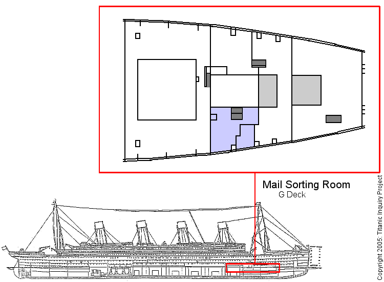 Než Titanic zamířil do svého cíle v New Yorku bylo na jeho palubu přivezeno 3 364 poštovních pytlů, a to na třech místech – v přístavu nalodění v anglickém Southamptonu (1 758 pytlů), ve francouzském Cherbourgu (1 412 pytlů) a v irském Queenstownu (194 pytlů). Před vyplutím úředníci prováděli rutinní úkoly spočívající v kontrole poštovních pytlů a ukládání těch, které během plavby nevyžadovaly jejich pozornost. Když Titanic vyplul, pět poštovních zaměstnanců začalo třídit poštu a rozdělovat dopisy a balíky do poštovních pytlů podle jejich konečného určení. Jejich cílem bylo odeslat poštu z Titaniku ihned po příjezdu do karanténní stanice v newyorském zálivu, kde se všechny připlouvající lodě zadržovaly kvůli zdravotní kontrole. Pošta byla považována za vzácný náklad. Paroplavební společnosti a poštovní systém vynaložily velké úsilí, aby zajistily její bezpečnost. Od úředníků námořní pošty se očekávalo, že budou poštu chránit za každou cenu. Poštovní úřad měl své místo ve dvou podlažích hluboko v podpalubí. Třídírna byla na palubě G a sklad zásilek ještě o patro níže. Když loď v noci ze 14. na 15. dubna 1912 narazila na ledovec, byla pošta jedním z prvních prostorů, které nabraly vodu. Během několika minut po nárazu pracovali poštovní zaměstnanci po kolena ve vodě, když se snažili zachránit alespoň 200 pytlů doporučené pošty s cennými zásilkami a tahali je po schodech na palubu C. O pouhých pět minut později se začala zaplavovat samotná třídírna. Muži odmítli opustit své stanoviště a pokračovali v přenášení pytlů s poštou z paluby G na palubu C. Přestože nelze přesně zjistit, kolik dopisů se při potopení Titaniku ztratilo, novinové zprávy z té doby uvádějí, že šlo o 200 poštovních pytlů s doporučenými zásilkami, které obsahovaly přibližně 1,6 milionu dopisů, zatímco zbývajících 3 164 standardních poštovních pytlů obsahovalo každý asi 2 000 zásilek na každý. Celková ztráta se odhadovala na šest až devět milionů dopisů a 700 až 800 balíkových zásilek.