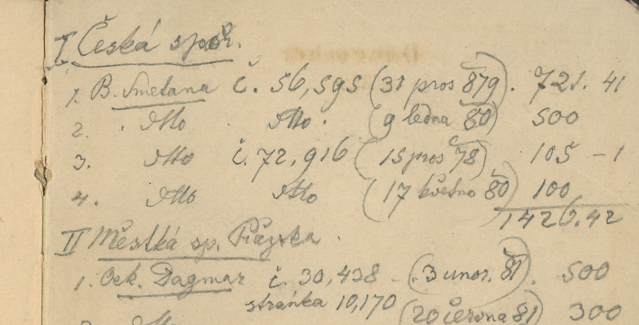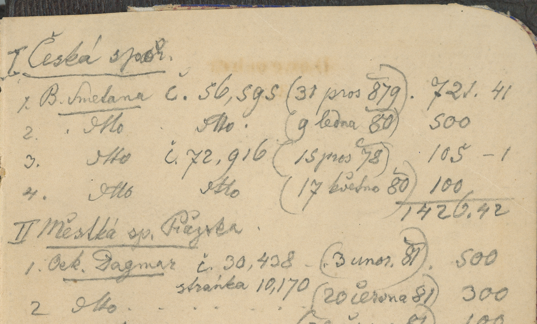Na následující straně začíná podrobný přehled Smetanova jmění. Finanční otázky byly pro Smetanu velmi důležité a jejich záznamy jsou pro jeho deníky charakteristické. Také v našem diáři má mnoho poznámek účetní povahu. Ve jmenovaném soupise, uvedeném slovy „Mění naše až do posledního května“, vypisuje Smetana svou hotovost uchovávanou ve třech peněženkách („portefeuille“) „Mimo toho nosím u sebe několik zlatek, tak že mění k potřebě všední obnáší dne 22. května 260 zl. na celý rok“. Zajímavé jsou rovněž záznamy zakoupeného zboží, které mají čistě prozaický charakter a nalezneme mezi nimi např. „teppichy, sklenice, houpací fouteille (křeslo), srcadlo, zvonek, nebozyz“ ale také „cigara, kolečka na kúří oka“ a pravděpodobně léky „proti zácpě“. Na dalších listech se objevují též zápisky evidentně mladší, než z roku 1882. Některé jsou přímo datovány ke konci roku 1883, resp. na počátek roku 1884, v němž Smetana zemřel.
