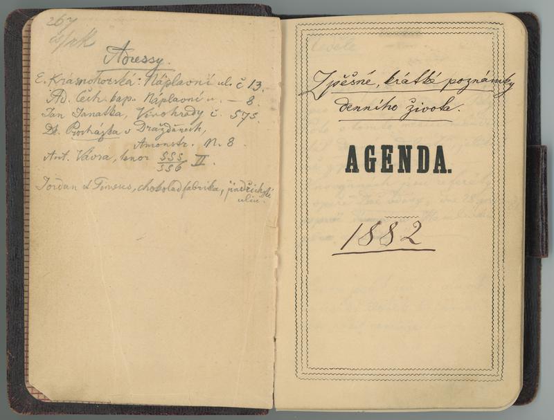 Nelitujme chvilky a podívejme se na zápisník podrobněji, zaslouží si to. Nenápadná knížečka formátu 15 x 10 cm je svázána v hnědých kožených deskách opatřených poutkem k zasunutí tužky. Předsádky jsou z bílého papíru potištěného červenohnědým kostkovým vzorem. Jedná se o jednoduchý diář, jaké byly ve své době obvyklé. Titulní list je opatřen pouze textem AGENDA, následují stránky ohraničené prostým vlnkovým rámečkem s německým uvedením dne a měsíce v záhlaví každé stránky. Pro každý den v roce tedy byla samostatná stránka. Smetana pravděpodobně diář používal jako cestovní zápisník. Zapisování různých záznamů věnoval značnou pozornost a prakticky po celý život si vedl různé deníky. Ty však pro jejich většinou rozměrnější formát nemohl běžně nosit při sobě, náš diář tak díky svým menším rozměrům nejspíše plnil roli jakéhosi poznámkového bloku, který Smetana měl kdykoli při ruce k okamžité potřebě, zejména během svých častých cest do Prahy i jinam.