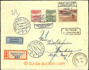 1930 issue II card sent by air mail to Vienna, franked with. Pof.L4 2x, 260, red special postmark Prague T. G. Masaryk 7.III.30 and PRAGUE 82-Airport 8.III.30, arrival postmark Wien Flugpost 8.III.30, good condition 1930 air-mail letter from Bratislava to Litoměřice, with Pof.L5, Pof.219, CDS Bratislava 1/ 25.VII.30, Bratislava's straight line postmark Airmail, on reverse missing upper lapel and postmark of air forwarding., good condition 1931-39 issue III comp. 7 pcs of air-mail letters, interesting destination as Sweden, Belgium, England, from that 2x the first flight Prague - Brussels, various quality 1932 issue III Reg and air-mail letter to Brazil, with Pof.L14, L13, L10, CDS Prague 1/ 24.III.32, on reverse Prague 7/ 24.III.32, transit Strasbourg and arrival postmark Buenos Aires 4.Abr.32, decorative envelope open from 3 sides 1932 issue III Reg and airmail letter to France, with Pof.L12, L8, L7, CDS air-mail Karlovy Vary airport 2.VI.32, then CDS PRAGUE 82-Airport 2.VI.32 and on reverse arrival Strasbourg 2.6.32, sent back, interesting, good condition U:A5