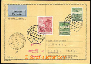 1938 1.flight Praha - Řím, card franked with Pof.L7, 334, cnl. Praha 82 Letiště 16.V.38 and incominng Roma Sempentara Aeroporto 19.5.38, one of the most sought after first flight. 1938 2 pcs of Ppc sent by air mail to England and Germany, franked with. i.a. air stamp. Pof.L7, L8, L10, 1x with cancel., mailing from letterbox, without attributes of air forwarding., undamaged 1938 issue III air-mail letter to France, with Pof.L7, L10, CDS Prague 1/ 12.VIII.38, on reverse air-mail Prague 7/ 12.VIII.38, transit and arrival postmarkl Perpignan 13.VIII.38, good condition 1938 III.issue airmail letter from Ministry of foreign affairs to czech consul in India, with Pof.L14, 305, cnl. Praha 11/ 15.I.38, bckstmp. Praha 7/ 15.I.38, incoming cnl. Calcutta 24.Jan.38, in good shape. 1938 issue III air-mail letter to Argentina, with Pof.L13, L12, L9, L7, CDS Bor by/on/at Česká Lípa 29.VII.38, on reverse arrival postmark Buenos Aires 3.Ago.38, fold in lower part of envelope out of stmp 1938 1938 III.issue airmail letter sent from Venezuelan consulate in Prague franked with 12pcs 20Kč(!), Pof.12x L14, L13, L9, overall 252Kč(!), Cnl. Praha 24.V.38, red cnl. Deutsche Luftpost / Europa Südamerika / c, reverse cnl. Praha 7/ 24.V.38,.