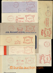 1939-41 comp. 4 pcs of R letters franked by meter stmp., General co-operative bank Prague 1, Economic/Agricultural group velkoobchodu...Praha 1, Riunione Adriatica Prague 1, Slavia Prague 1; good condition 1940 meter stmp as Commercial tiskopis(!), Fr. Borový, Prague 1/ 24.2.40 with postage stmp value 10h and red cancel. lowered postage...; good condition 1940 meter stmp as Commercial tiskopis(!), Kudrnáč, Náchod 9.2.40 with postage stmp value 10h and red cancel. lowered postage...; good condition 1940-41 comp. 3 pcs of envelopes with advertising added prints franked by meter stmp., 2x Kudrnáč Náchod, Palaba Slaný; decorative, good condition U:A5