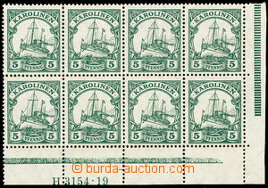 1923 CAROLINE ISLANDS Mi.A21 HAN, Ship 5Pf dark green, the bottom corner blok of 8, in lower margin "H 3154.19"; never hinged, cat. 170€
